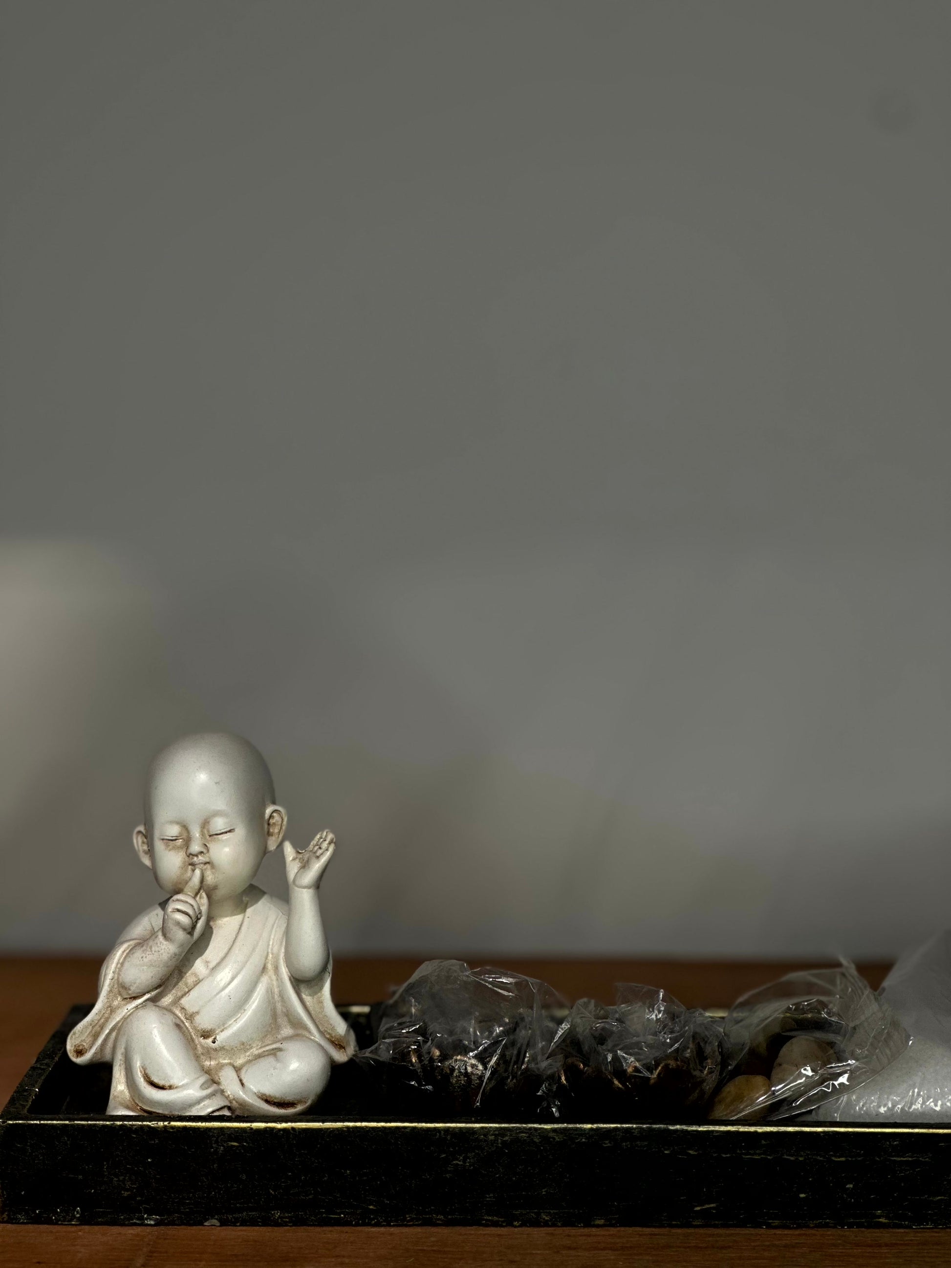 Set decorativo zen compuesto por una bandeja rectangular de madera, figura de Buddha en tono blanco envejecido y accesorios como piedras naturales, anillos y arena decorativa.