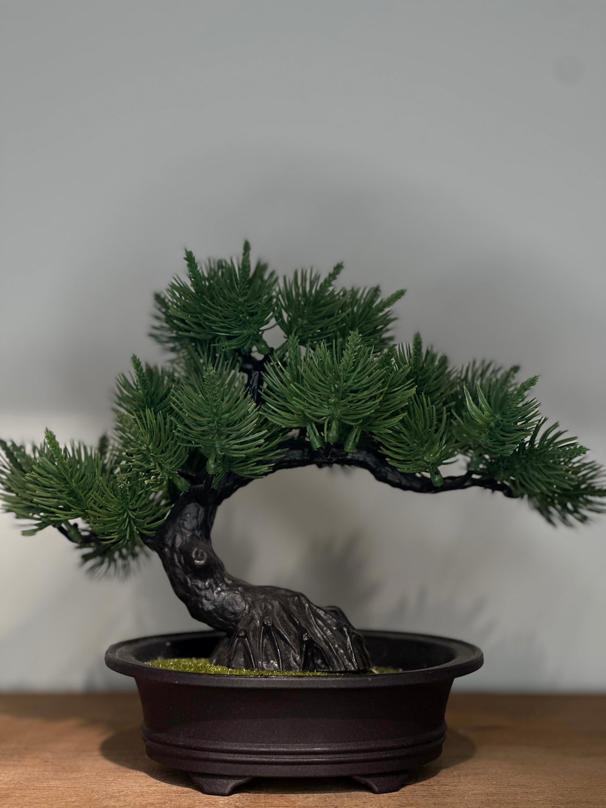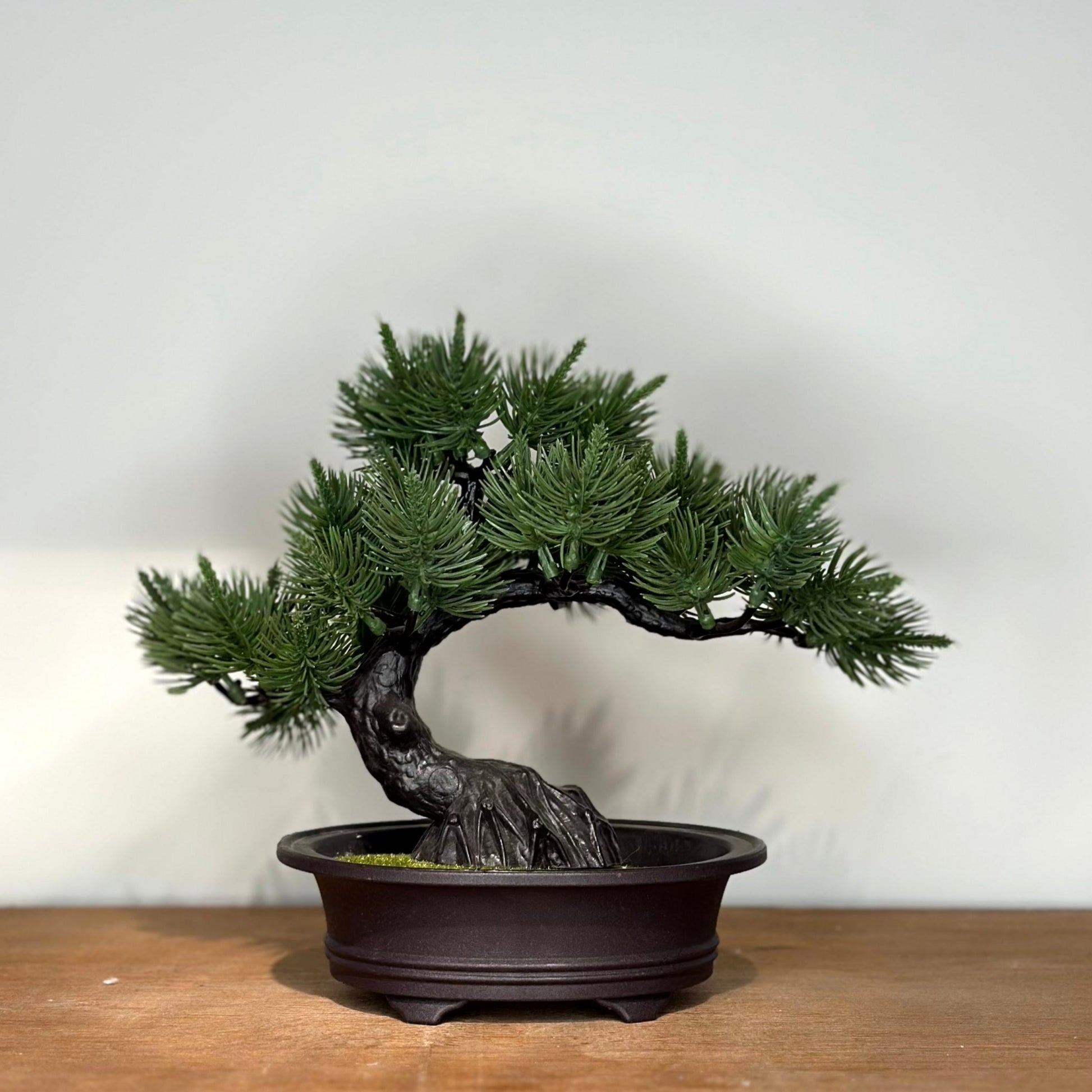 Bonsái artificial en macetero negro con acabado mate.