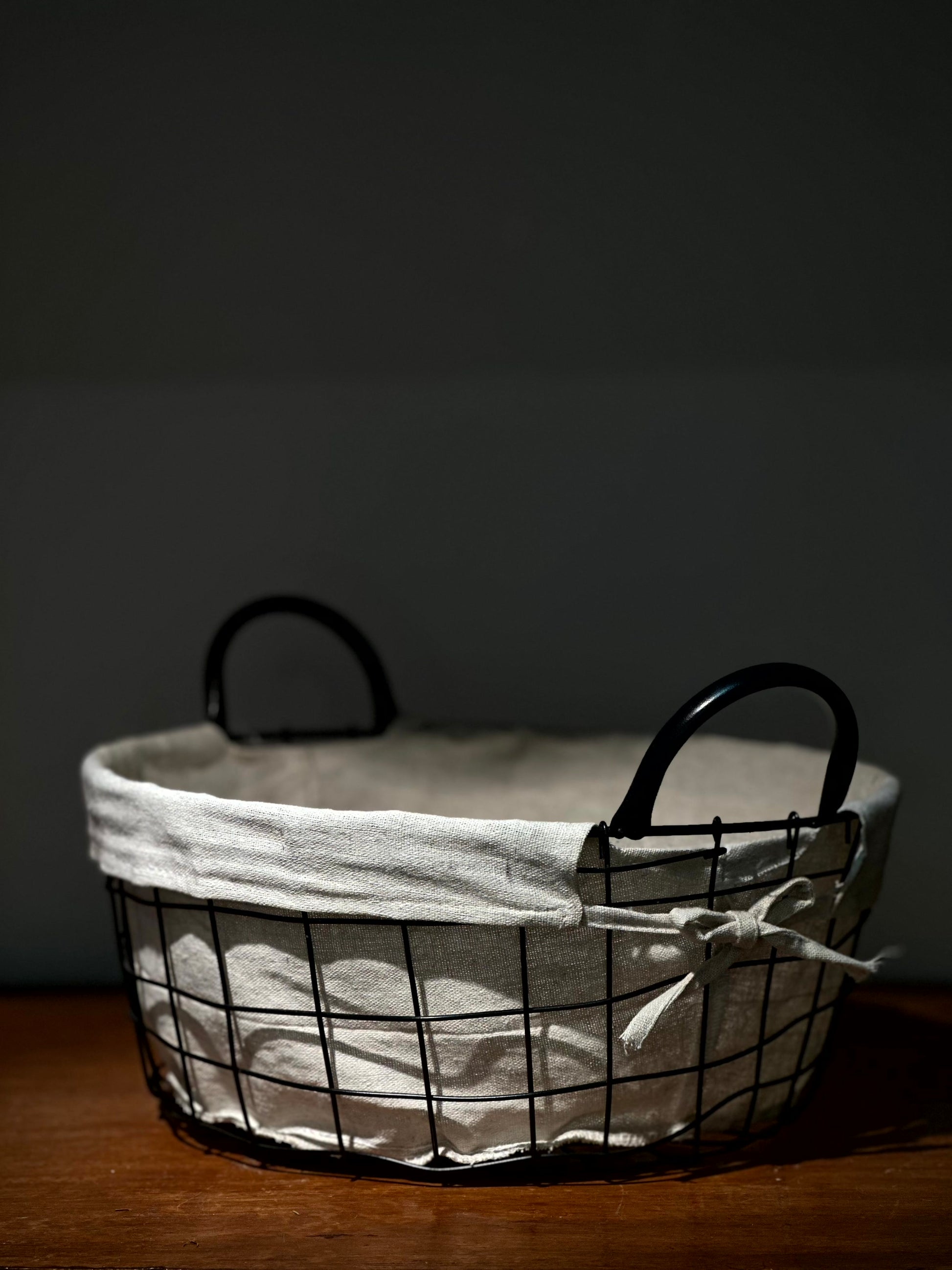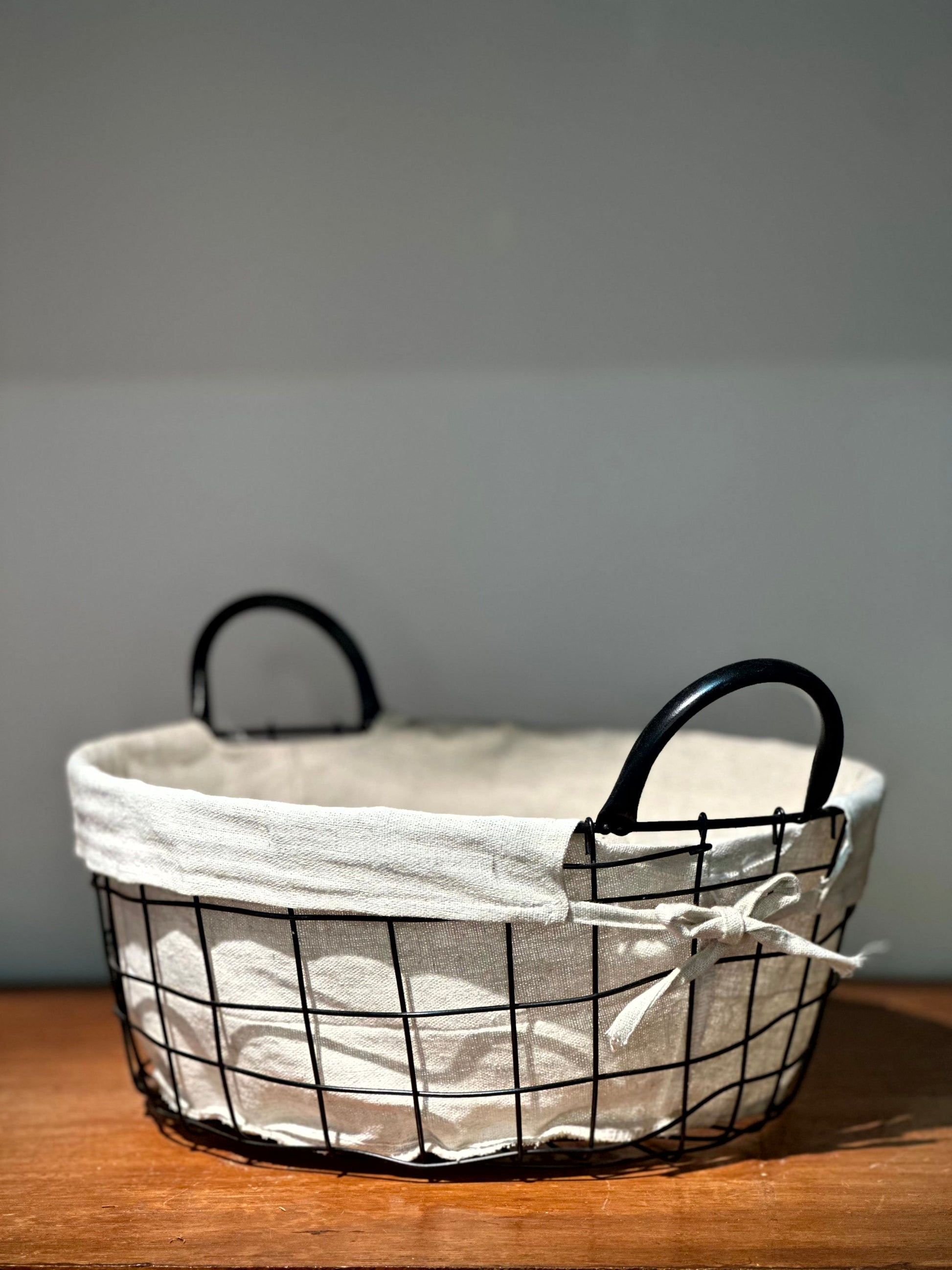 Canasto decorativo con estructura metálica negra y tela interior color crudo extraíble.