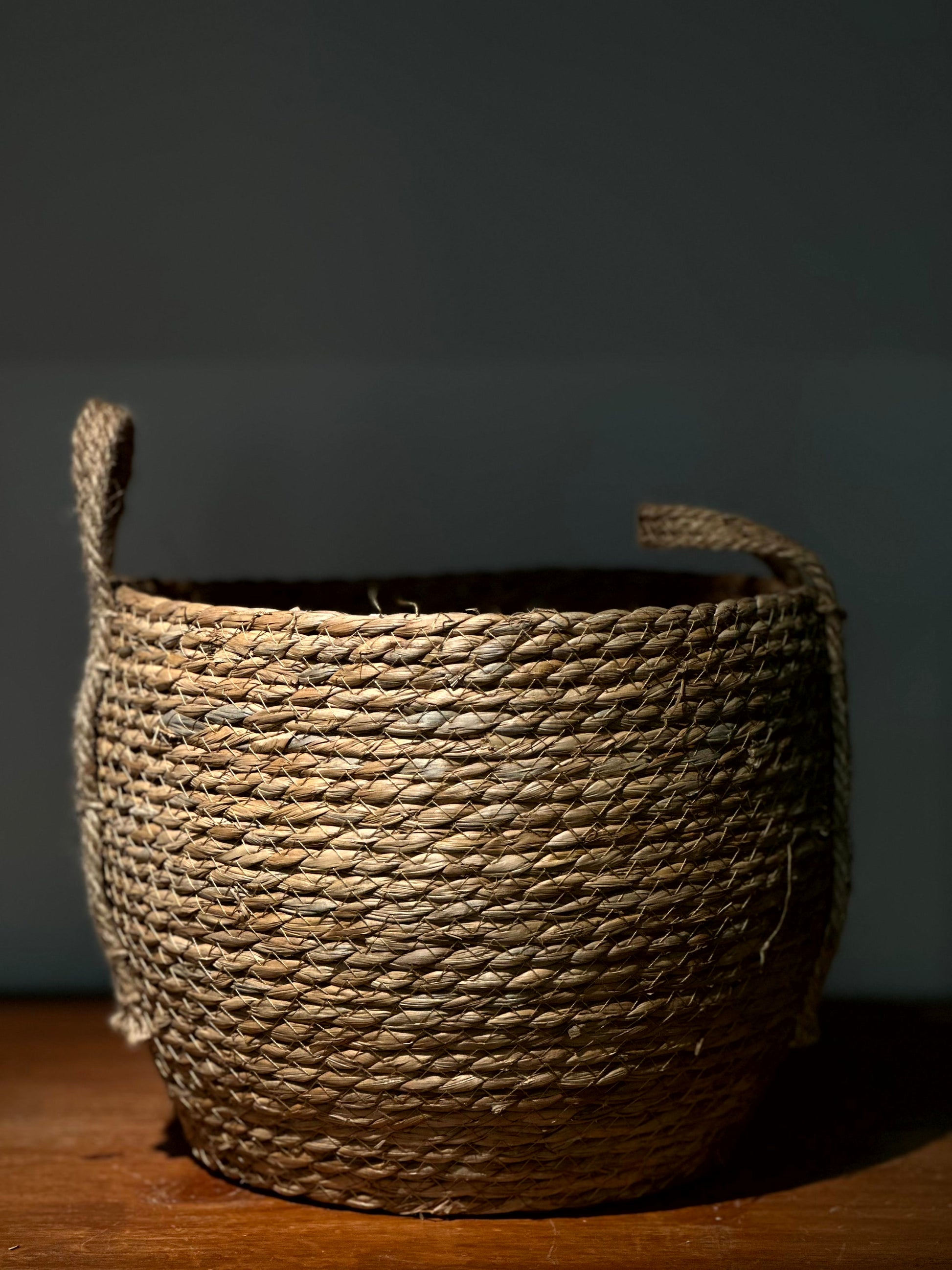 Canasto decorativo tejido en fibras naturales con base clara y trenzado bicolor.