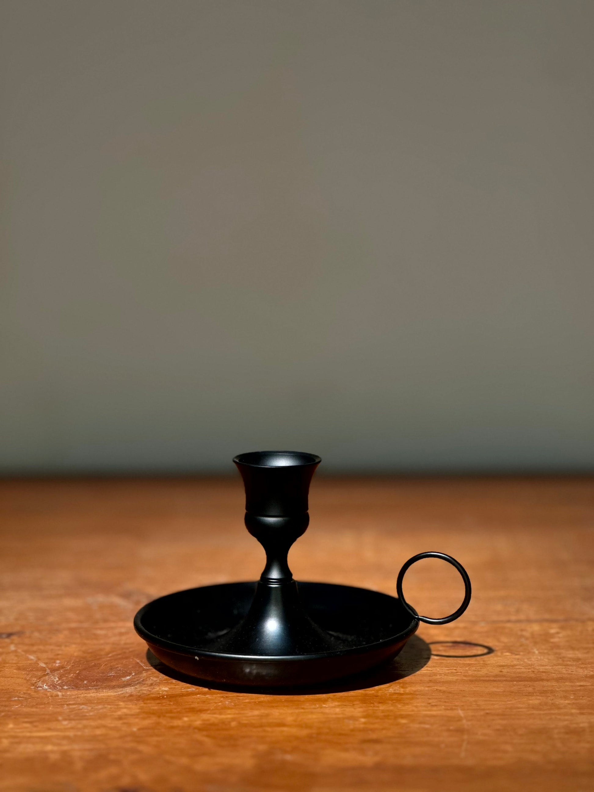 Candelabro clásico en acabado negro mate con plato recogegotas y asa lateral para un fácil transporte.