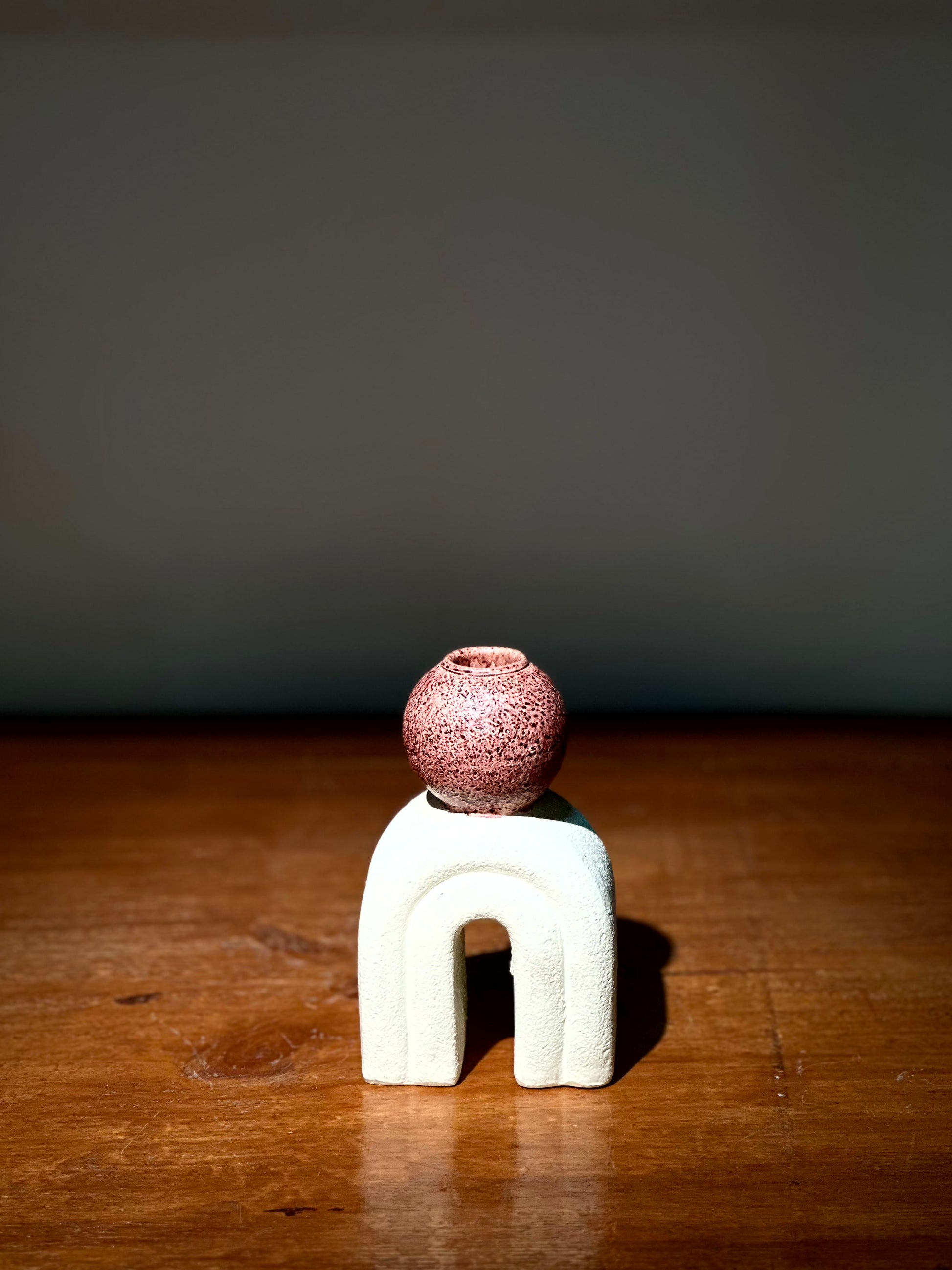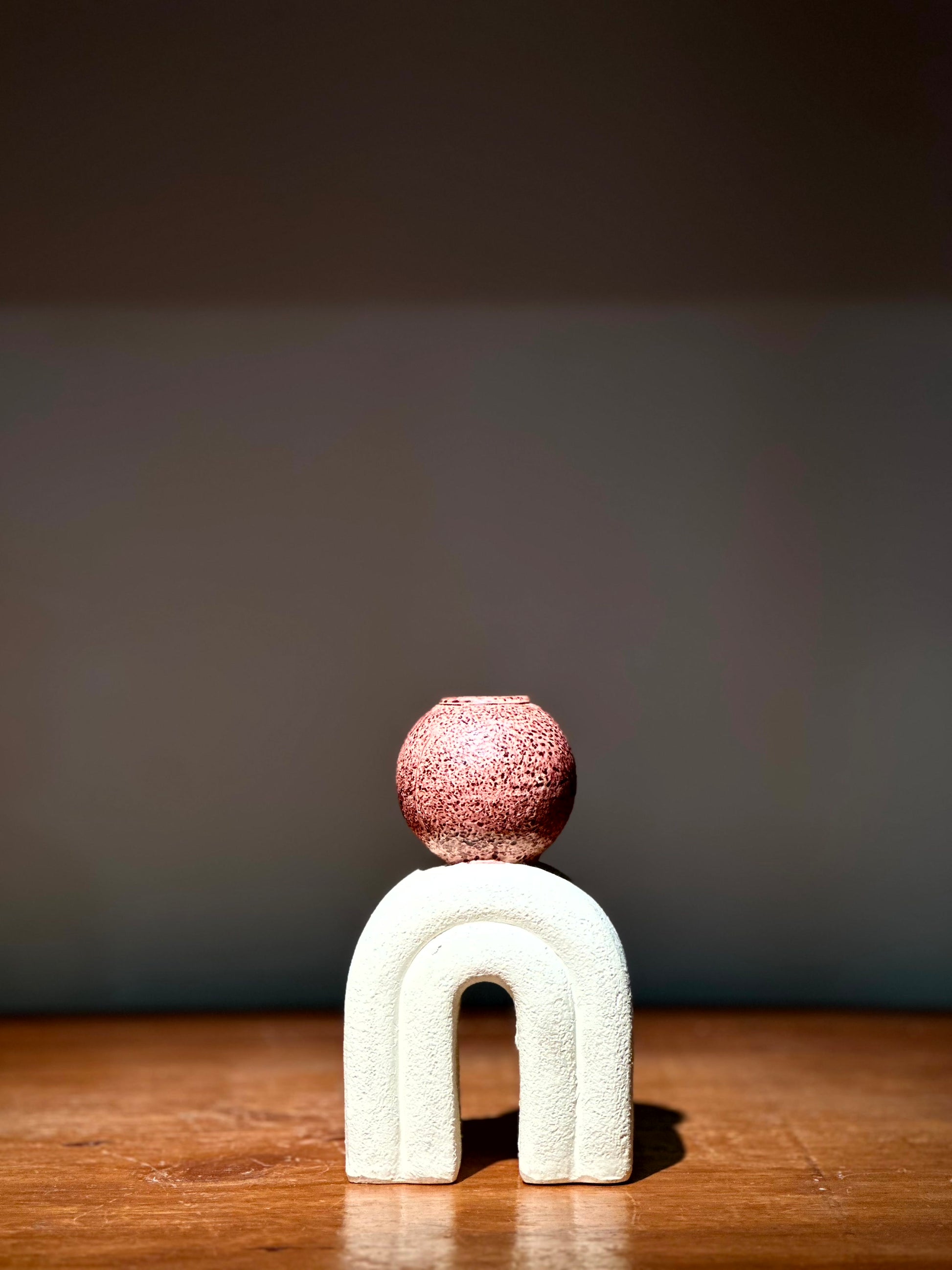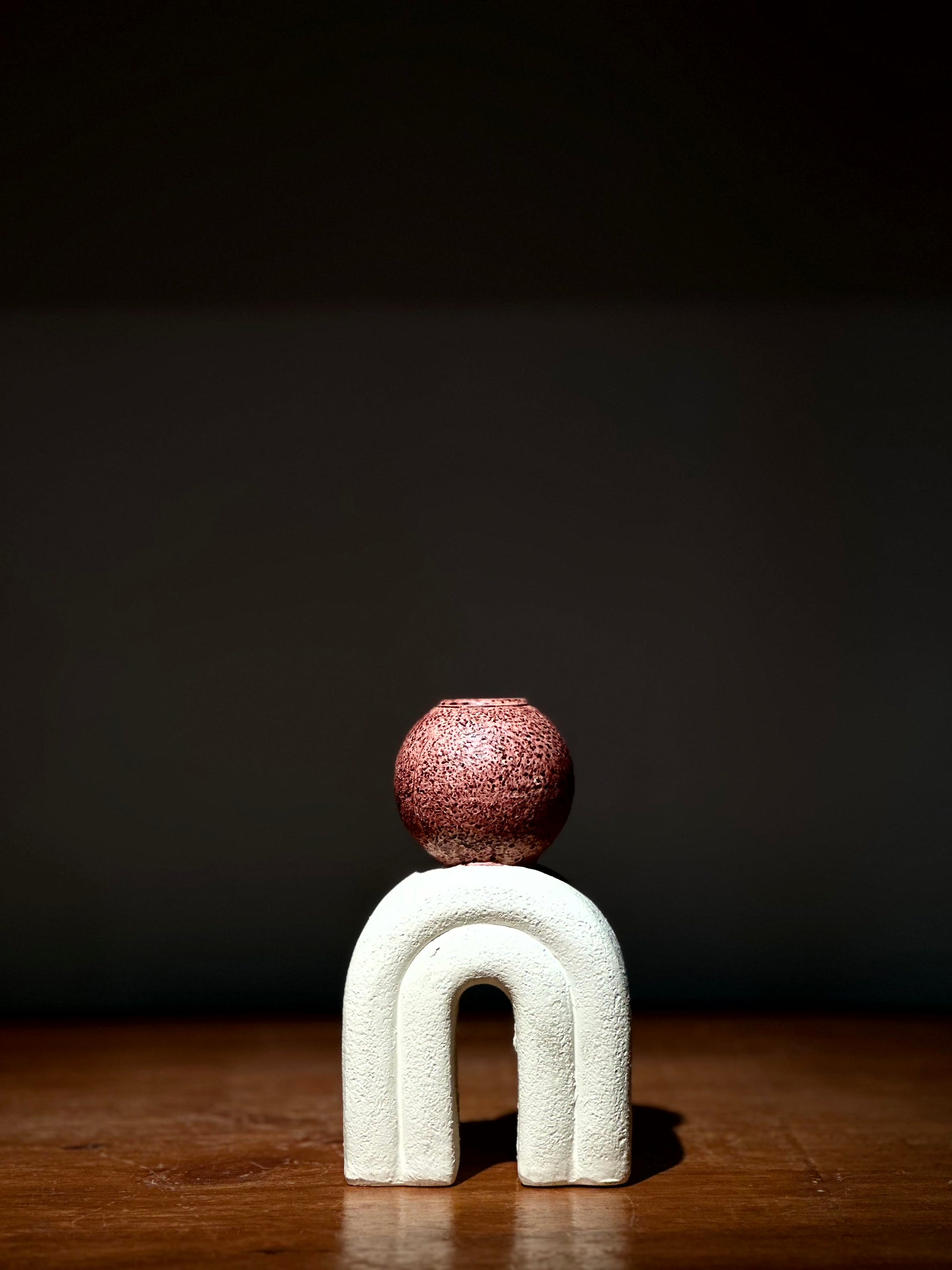 Candelabro decorativo con diseño escultórico: base blanca en forma de arco y soporte superior tipo esfera texturizada en color rojo terracota.