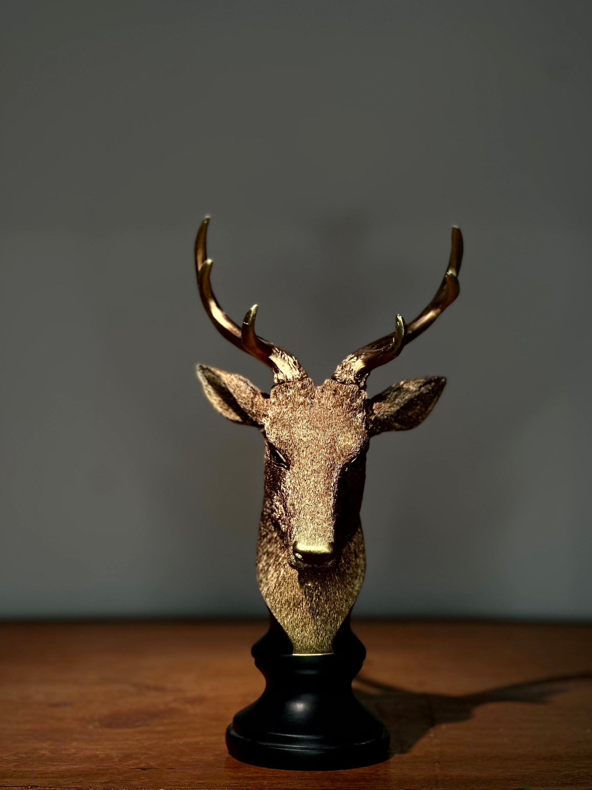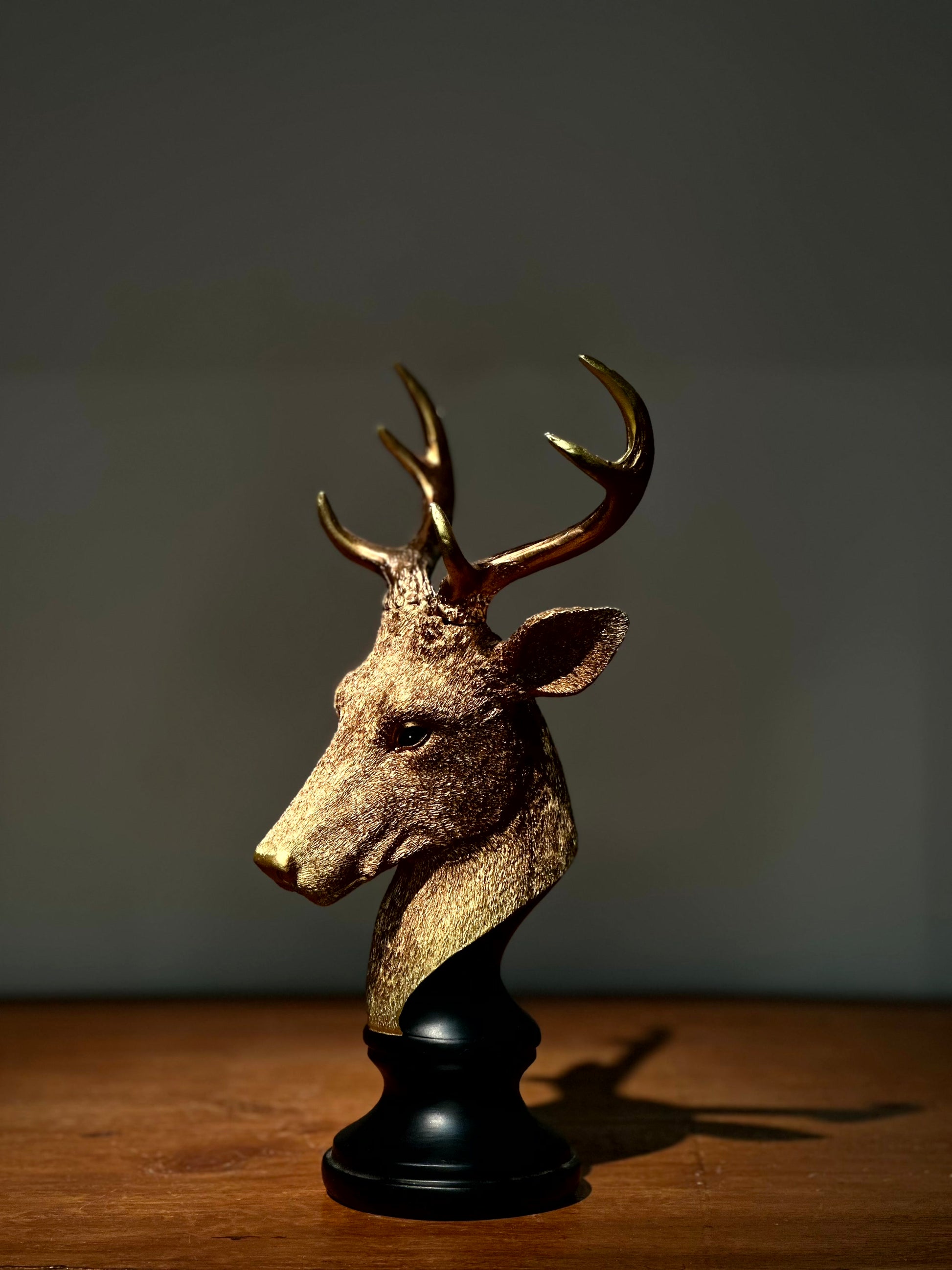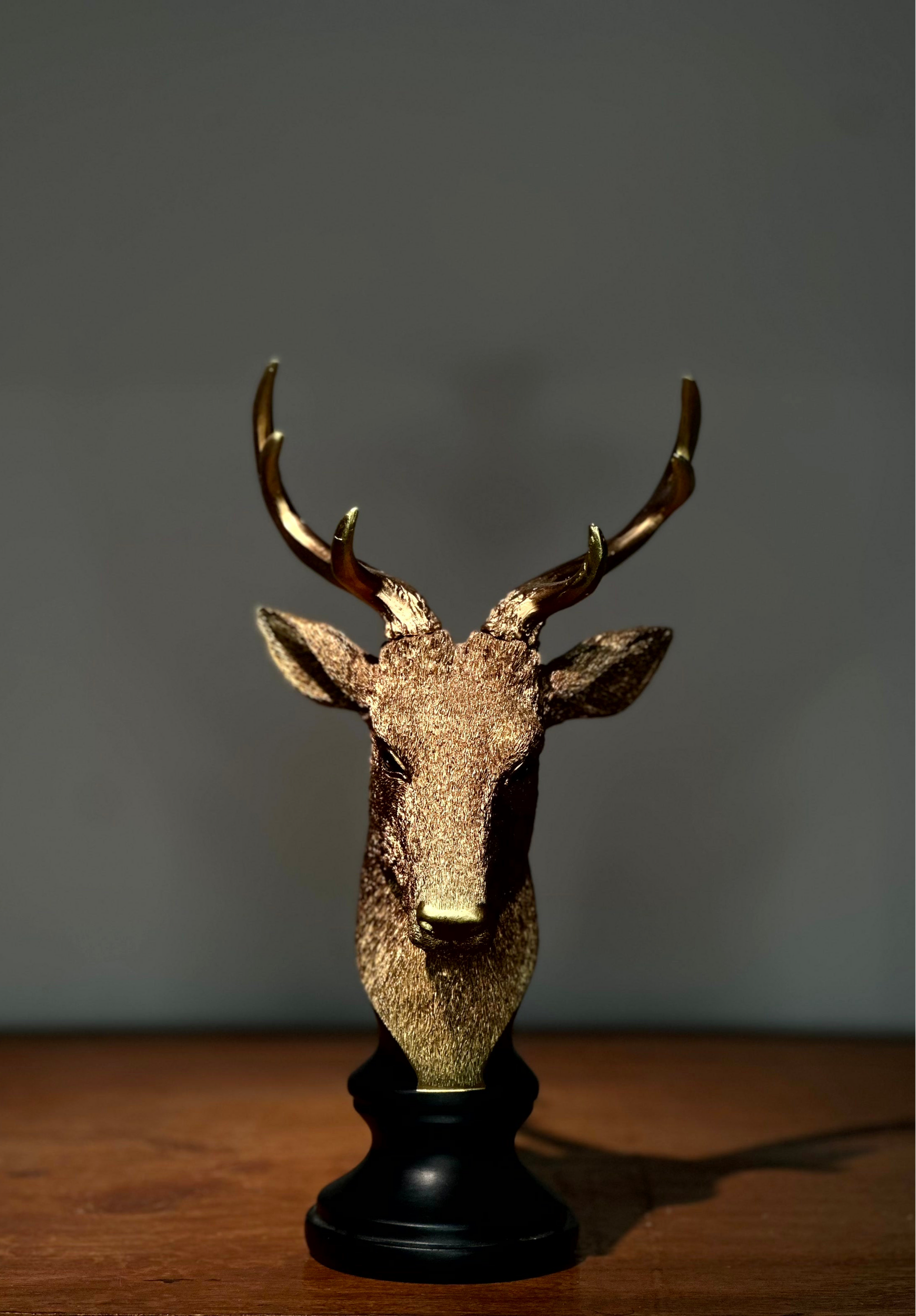 Escultura Decorativa Cabeza de Ciervo Dorado sobre Base Negra