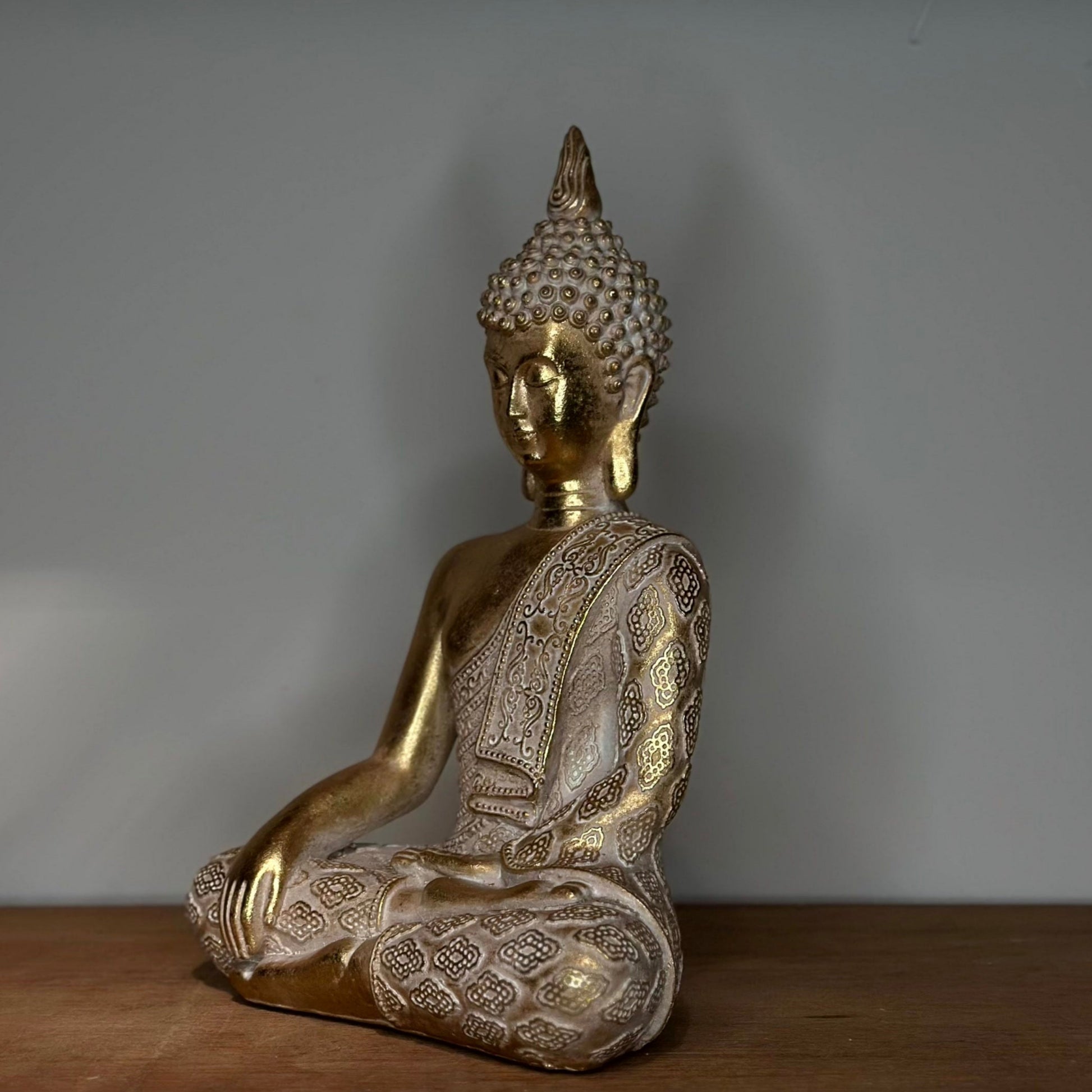 Escultura decorativa de Buda en posición de meditación, con acabado dorado envejecido y detalles en relieve sobre la túnica.