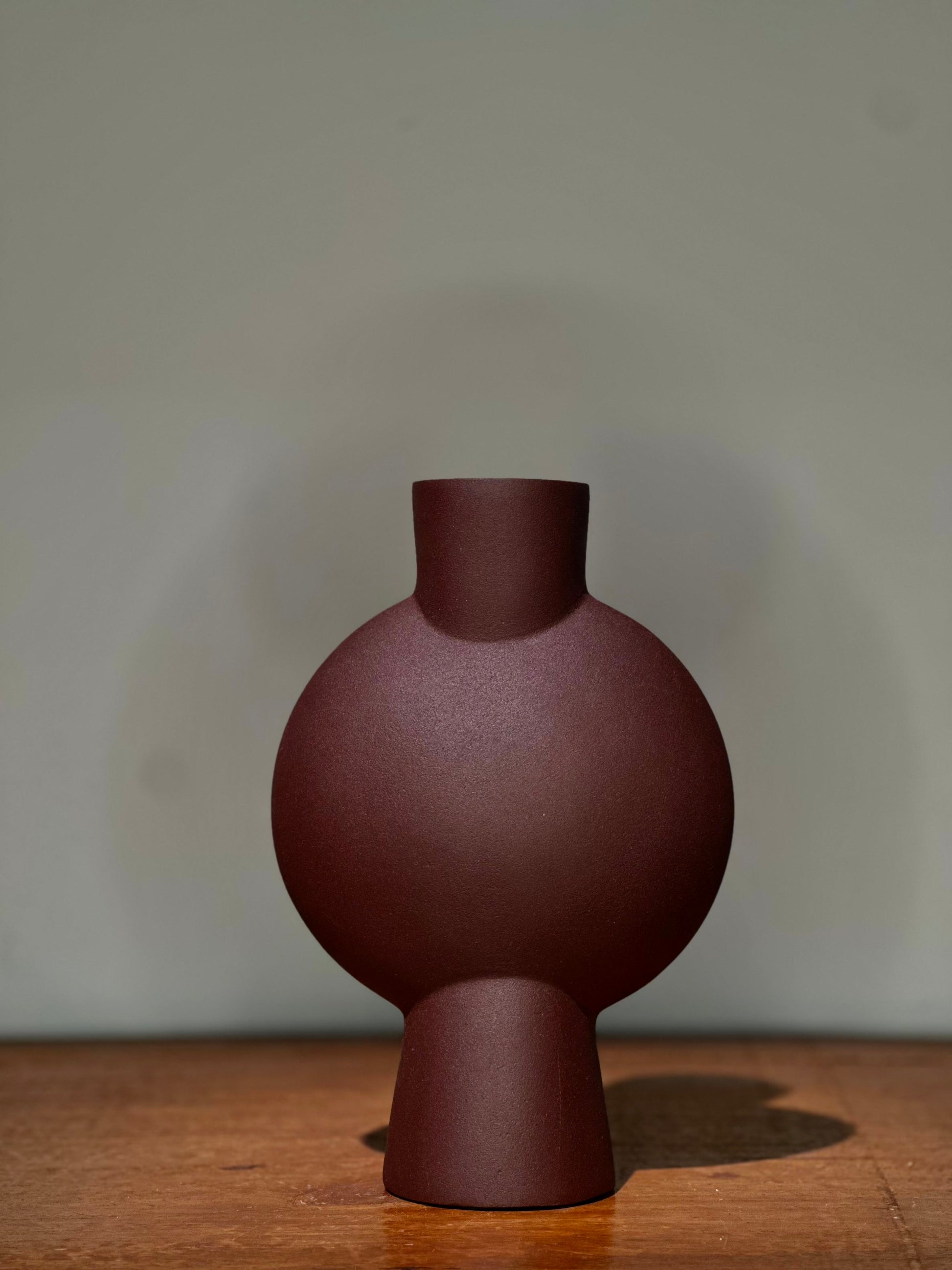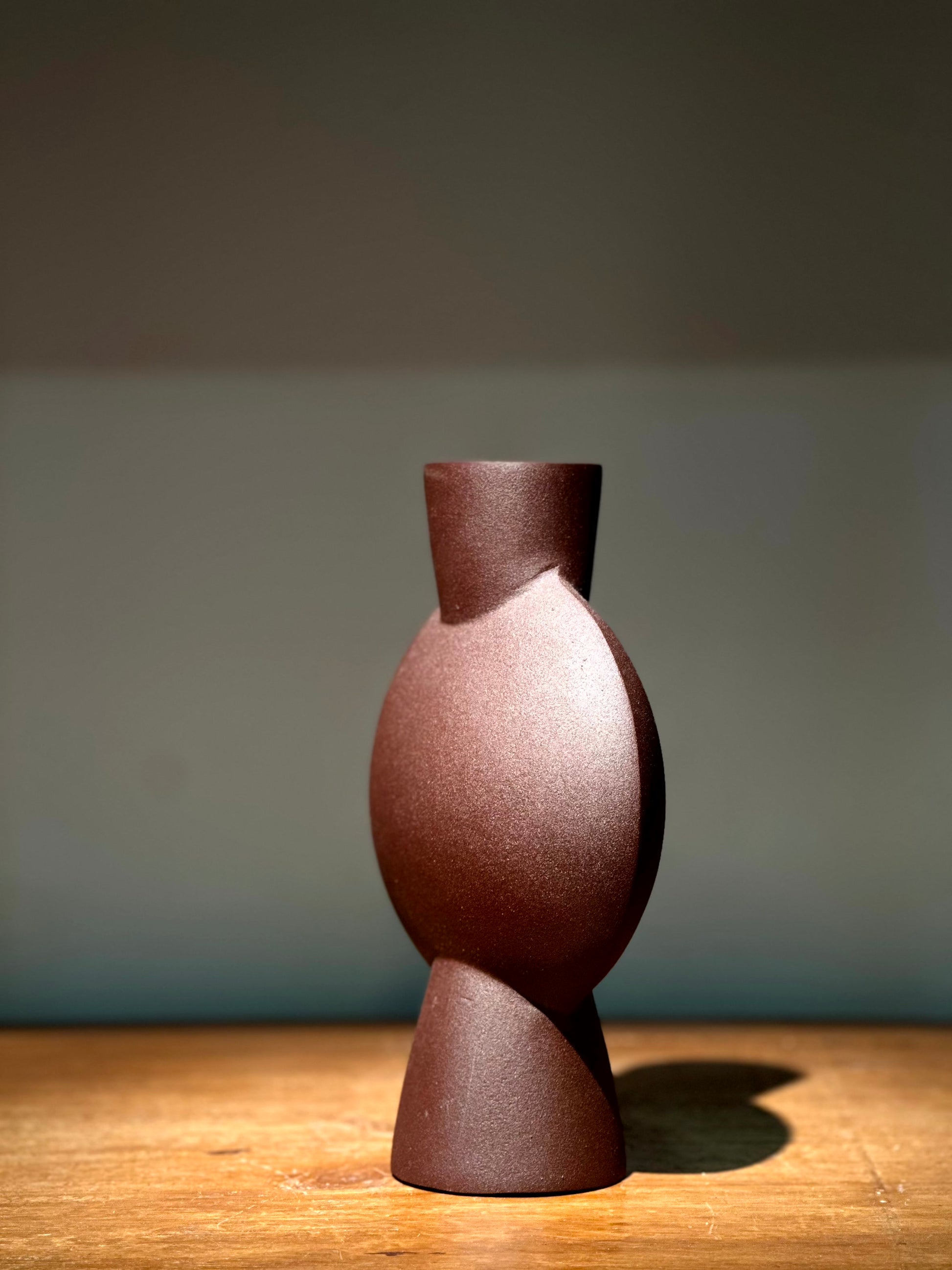 Florero decorativo de vidrio con forma escultórica, acabado mate en tono marrón chocolate.