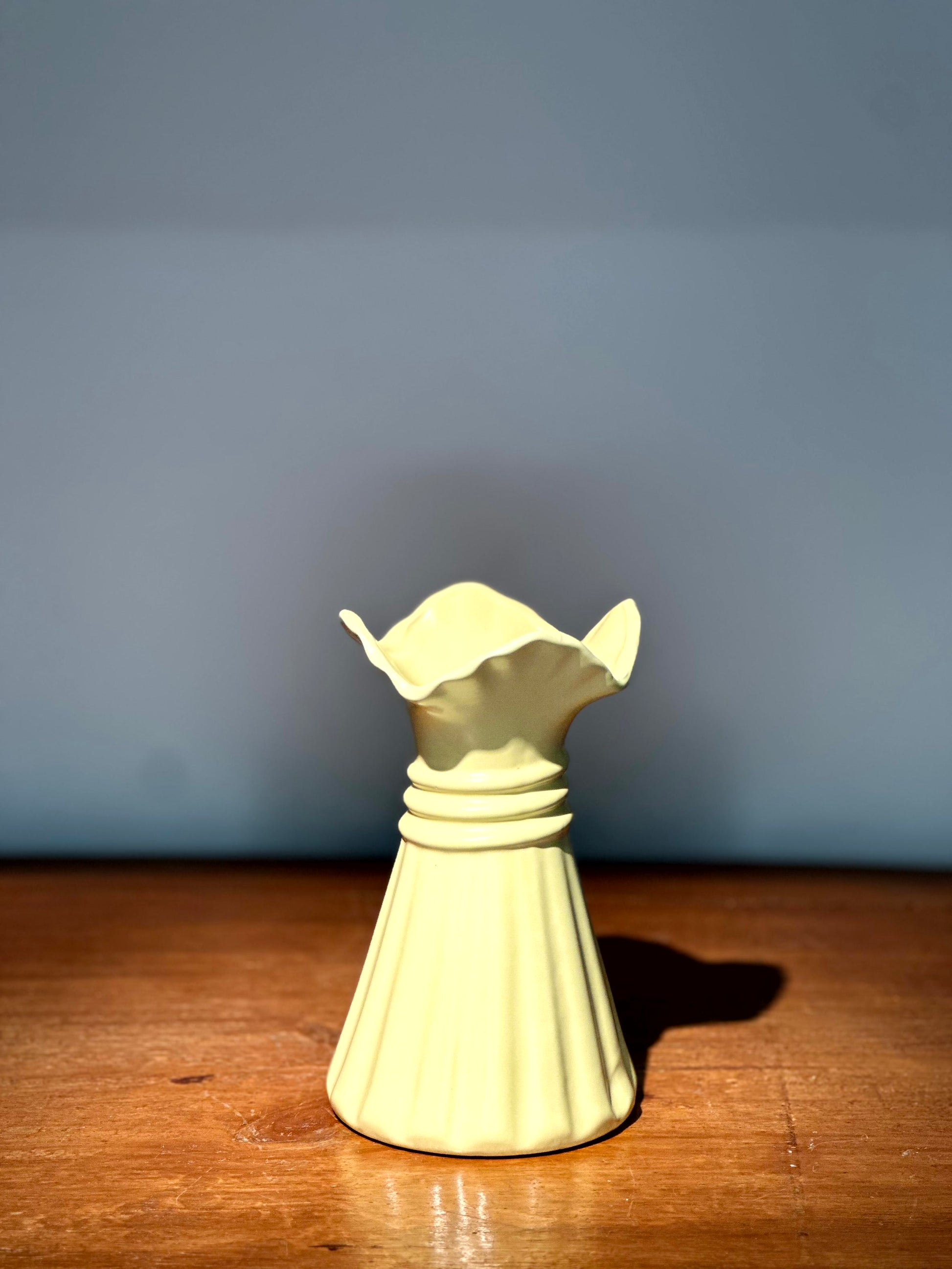 Florero decorativo con diseño rizado y colores pastel.