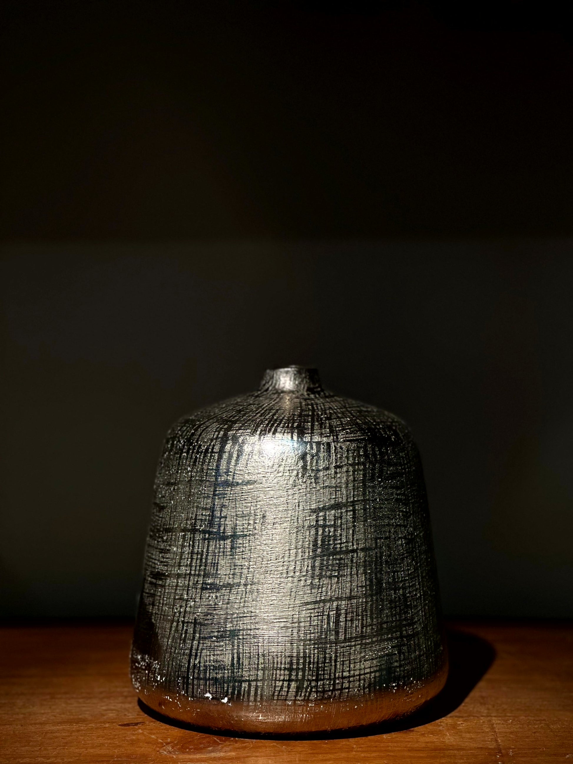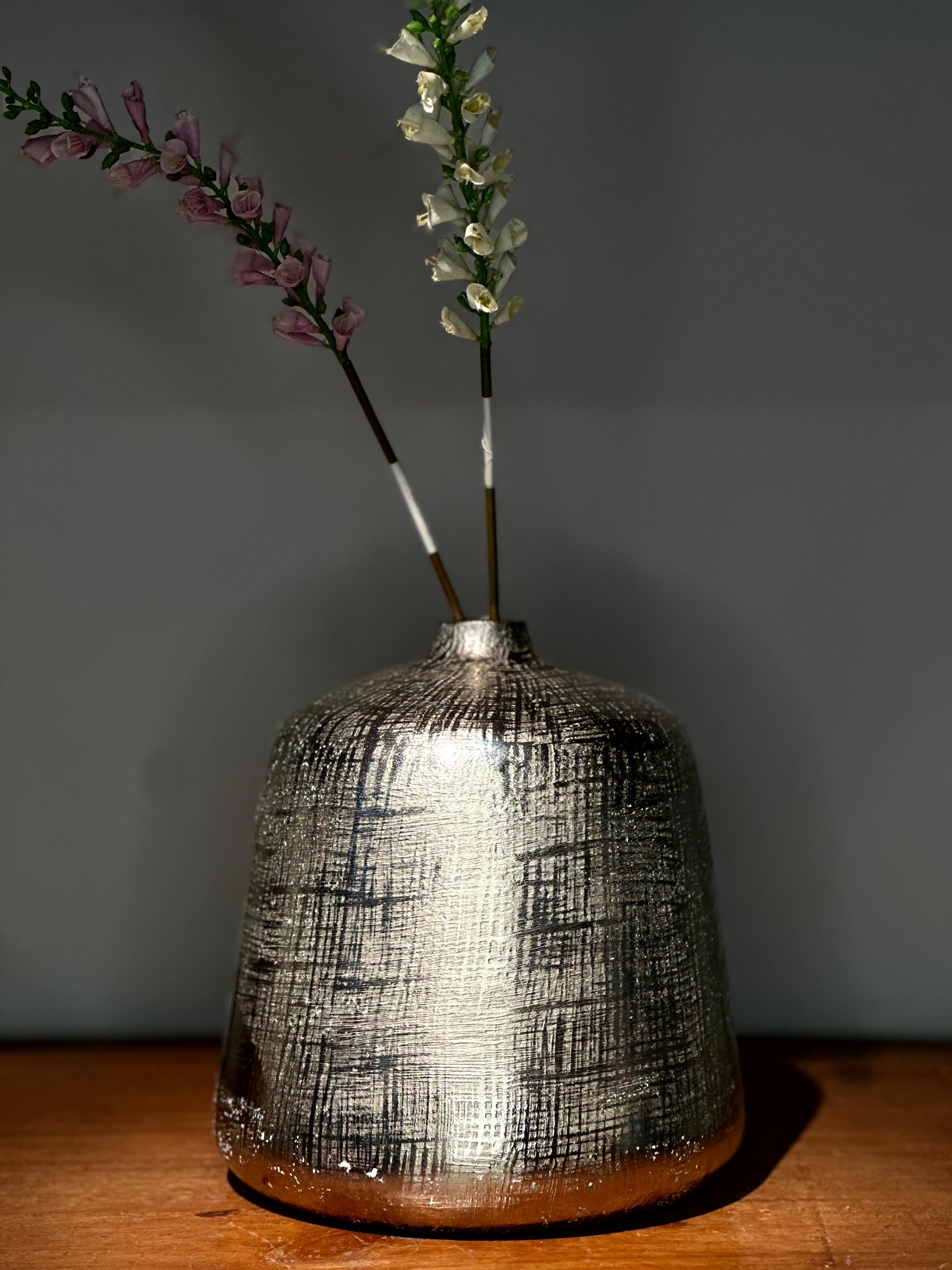 Florero decorativo robusto con acabado plateado brillante y textura lineal negra en relieve.