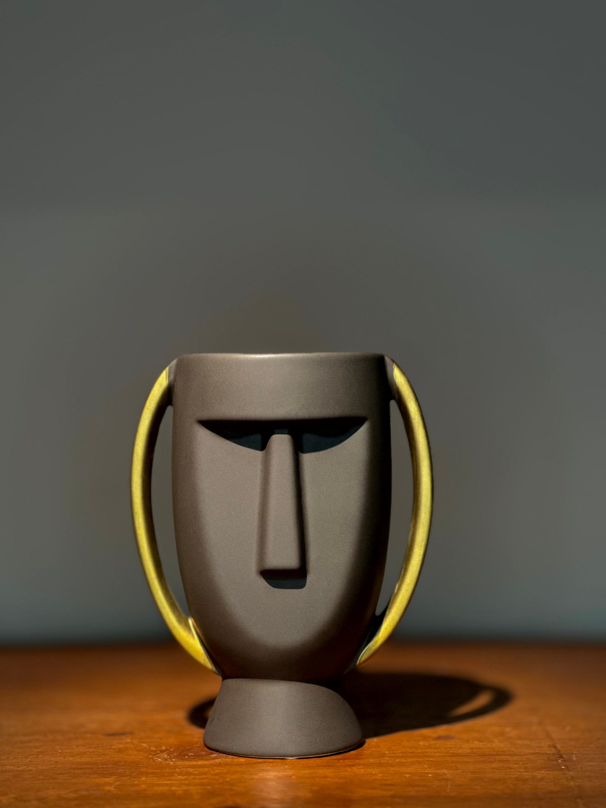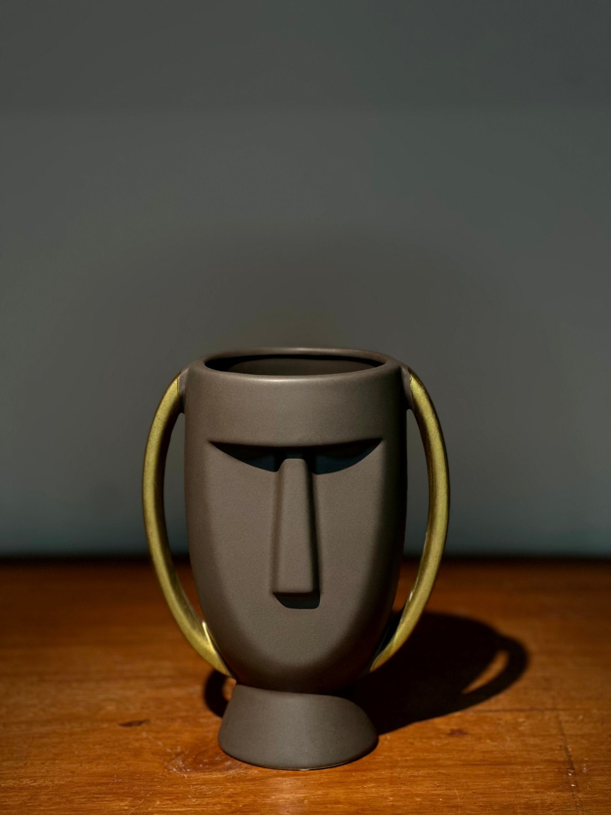 Florero decorativo con forma de rostro abstracto y asas laterales doradas.