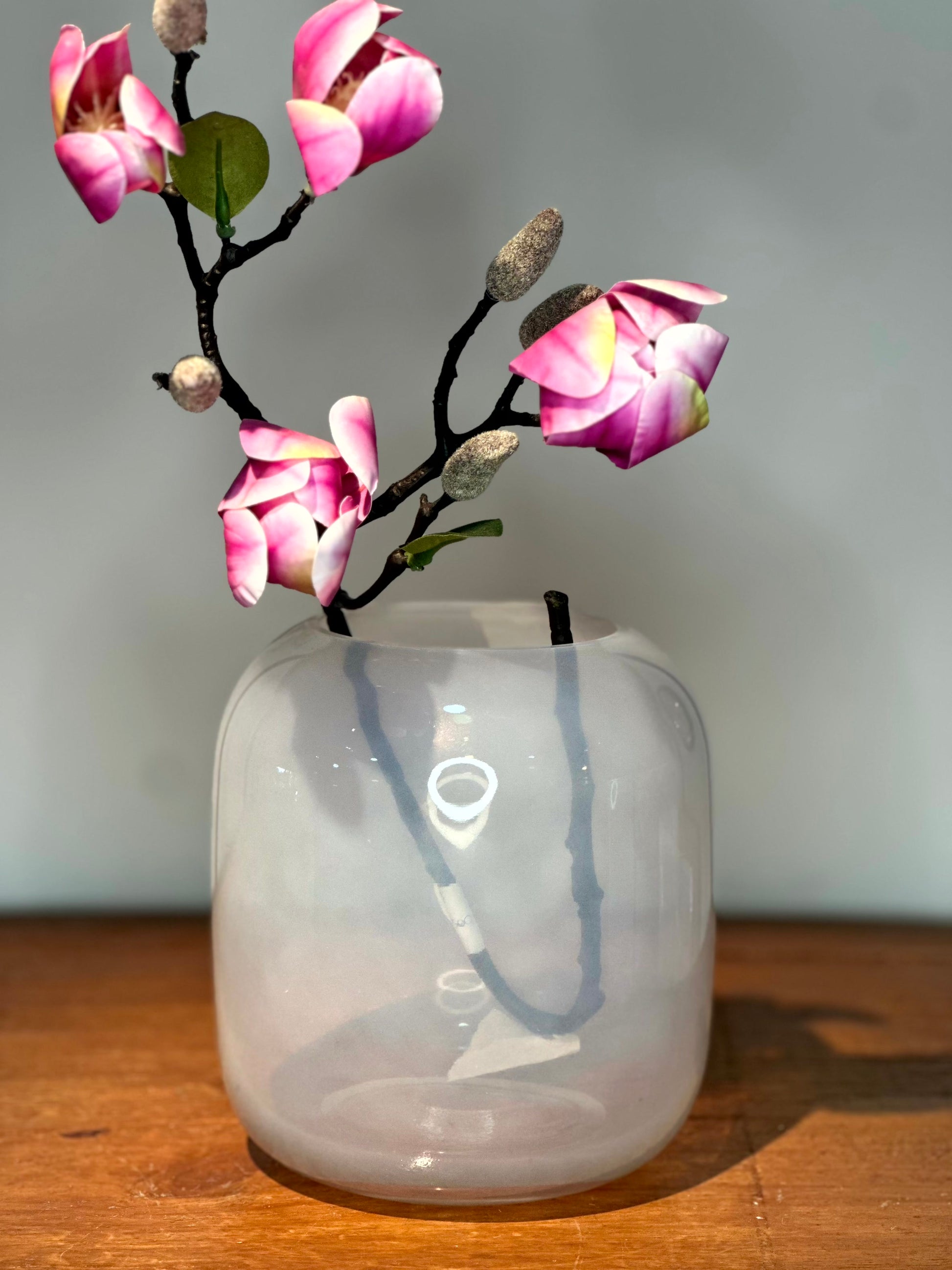 Florero de vidrio blanco opalino con acabado suave y translúcido.