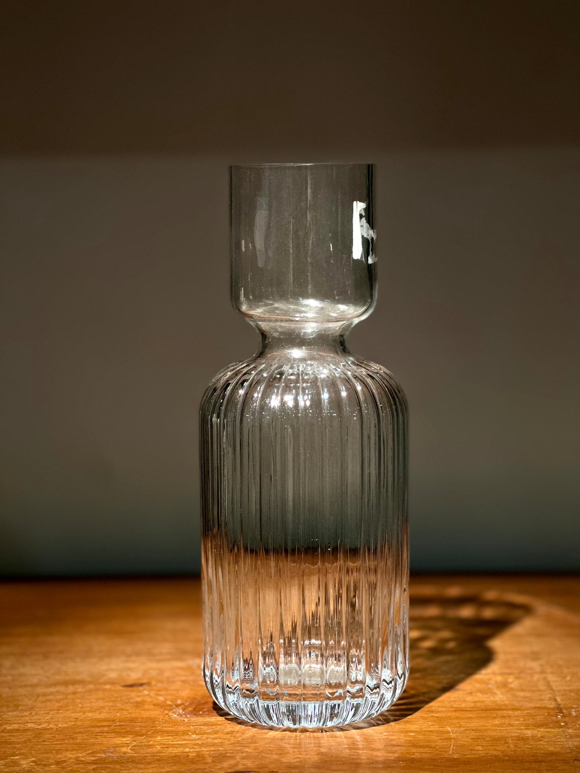 Florero alto de vidrio transparente con textura vertical en la base y cuello liso.