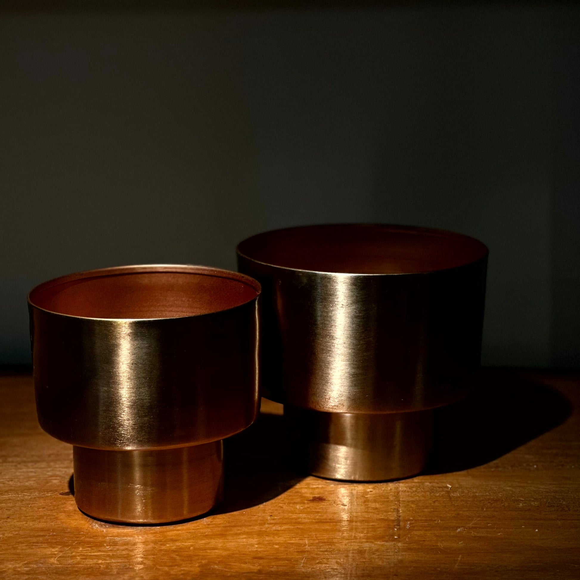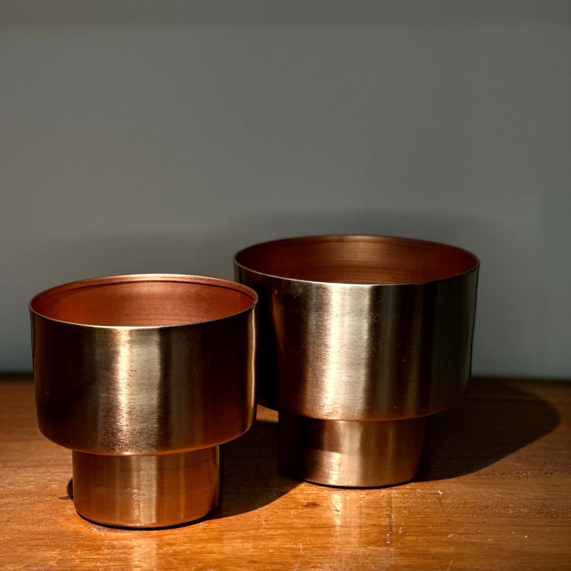 Macetero decorativo con acabado metálico en tono cobre, elegante y sofisticado.