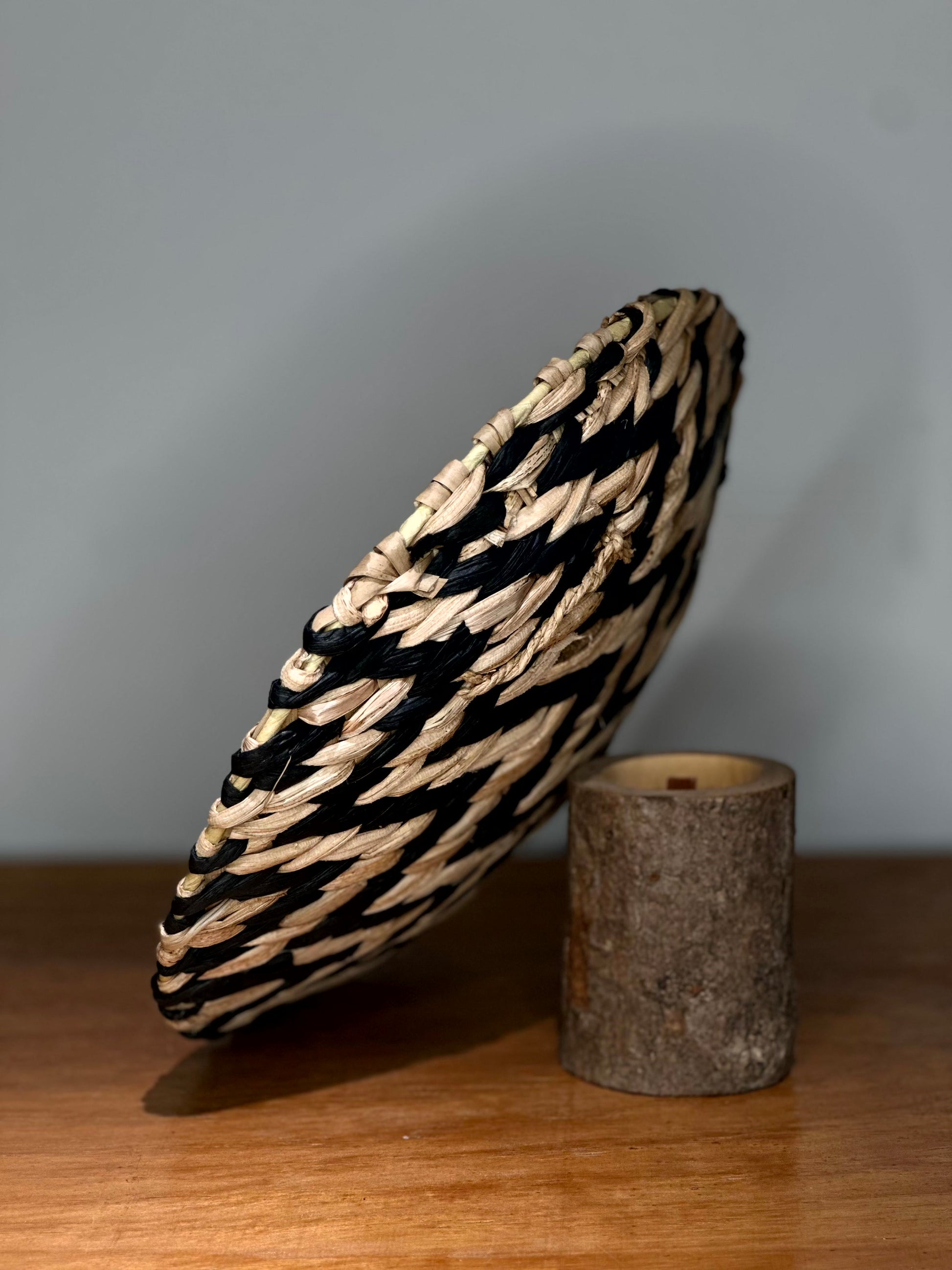 Plato decorativo tejido a mano con fibras naturales en tonos negro y crudo.