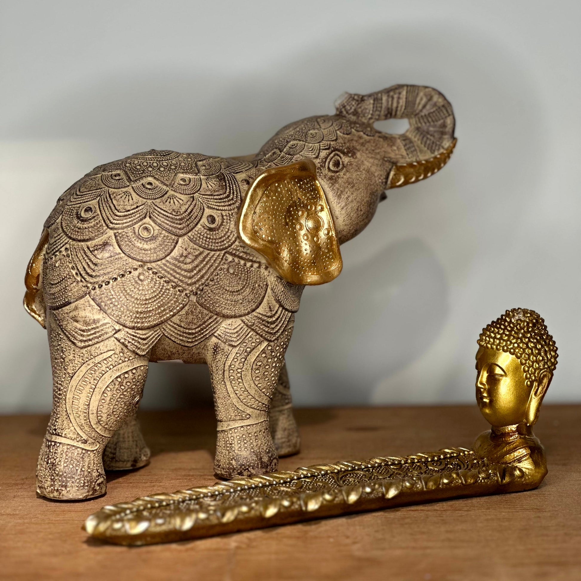 Porta incienso artesanal con diseño detallado en tonos dorados, coronado con la figura de un Buda meditativo. Un accesorio perfecto para tus rituales de relajación, meditación o decoración espiritual del hogar.