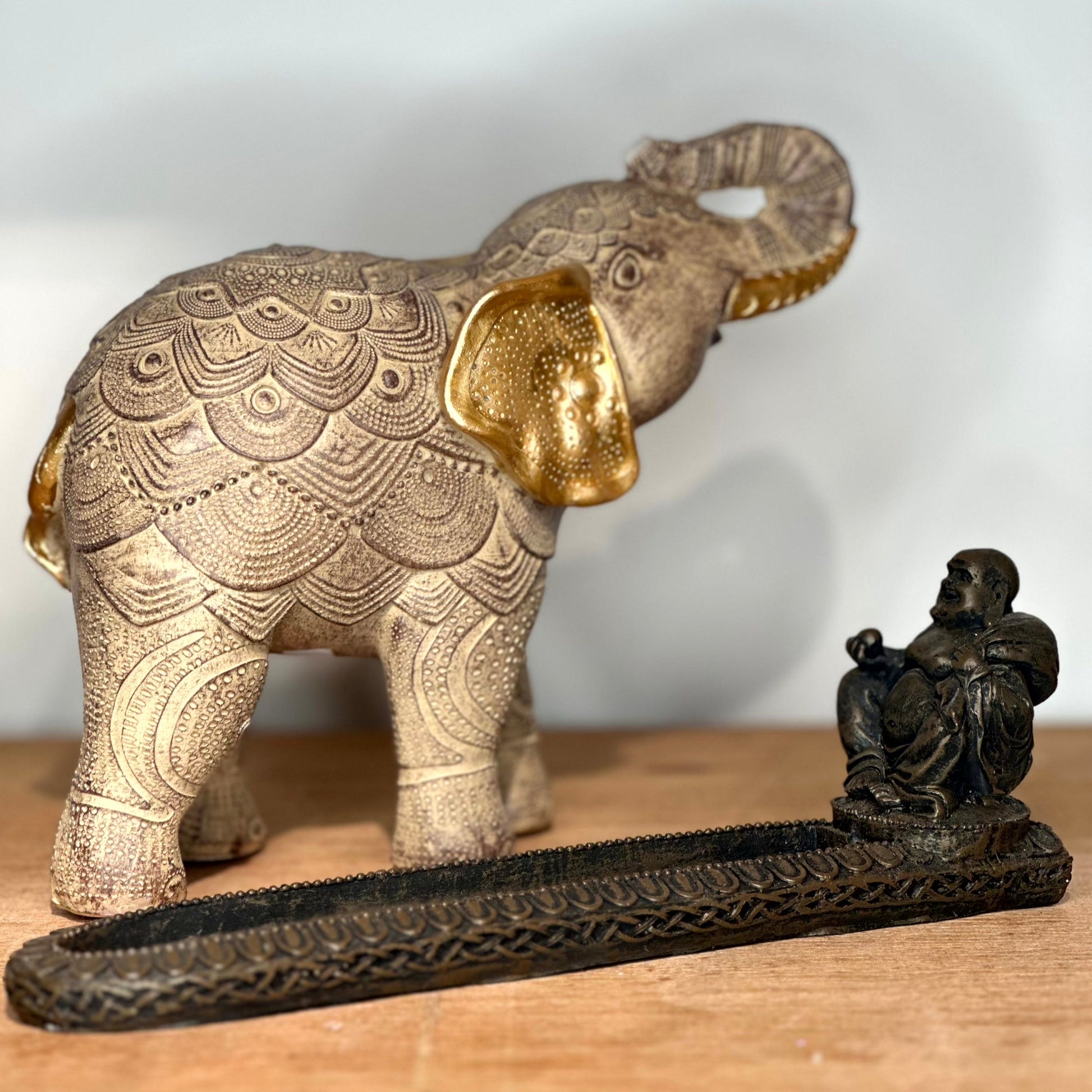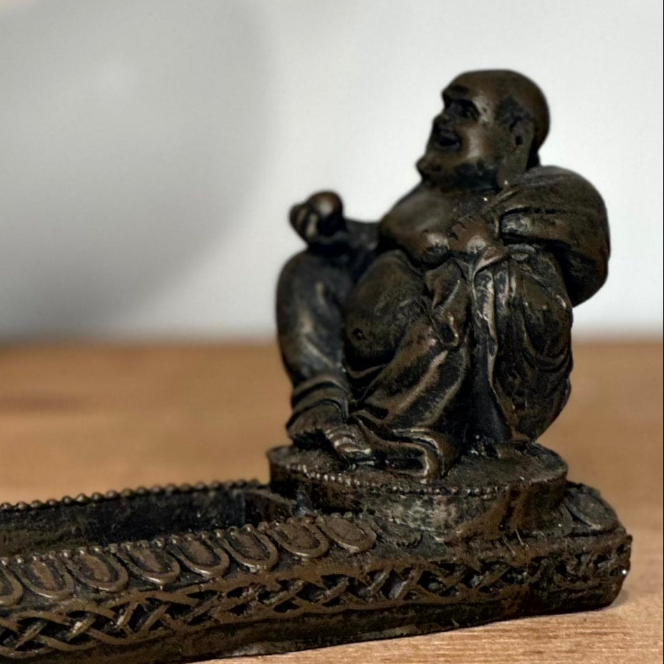 Porta incienso decorativo con forma de hoja y figura de monje en acabado dorado. Perfecto para crear un ambiente relajante en tus espacios, ideal para meditación o decoración espiritual.